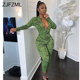 Printed Sexy Front Zipper Bodysuit Women V Neck Collars Skinny Long Sleeve Rompers Elegant Ladies One Piece Plus Size Jumpsuit